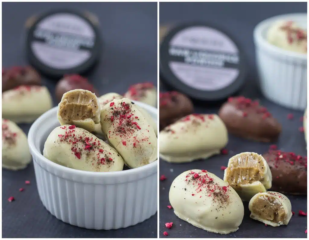 - Tag æggene ud af køleskabet og vend hvert æg et af gangen i den hvide chokolade. Sæt dem på et skærebræt eller ligende med bagepapir på - så hænger de ikke fast. Mens chokoladen stadig er våd drysser du med lidt lakridspulver og frysetørrede hindbær.